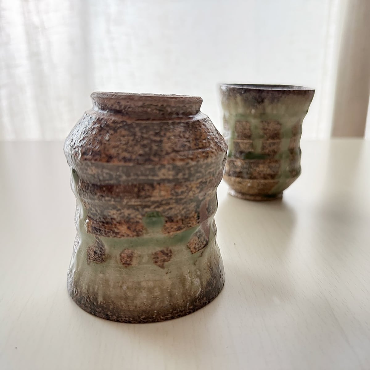 灰釉の透きとおった碧のビードロがお茶をさらに美味しくする。和を感じさせる、ぬくもりのある焼き色がほっと心を和ませる。